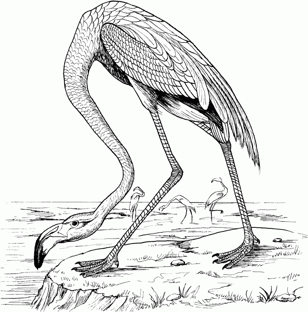 Flamingos are interesting creatures and make a fun coloring page subject. Standing up to 4 and a half feet tall, these glorious birds can live up to 30 years. Baby flamingos are born either gray or white and turn pink in the first few years. They’re definitely an ‘aquatic bird’. Their long legs are built for wading in shallow water. This is where they stay, because their diet consists of ‘seafood’! They eat algae, shrimp and water plants. Get creative with your colors and see what kind of flamingo art you can create with our free coloring pages. Download them all.